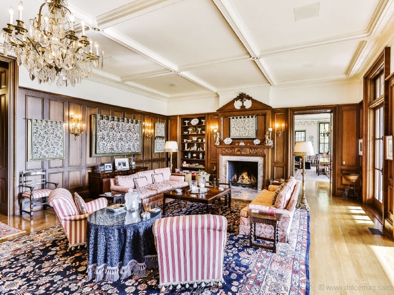A. The scale of the principal rooms and the architecture make this home unique. The barrel ceiling in the library is more than 25 feet high. The main living room has two hand-carved fireplaces with marble hearths that are so large, no fire screens are required. The chilled wine cellar is known as “the warehouse.”