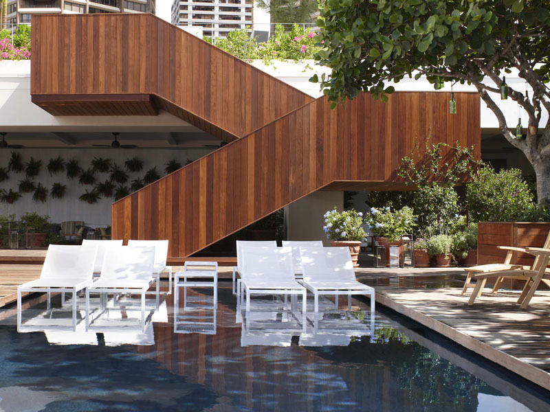 Another area of design that we focus on is within our hospitality division. We believe there is a hotel model that is not fully explored yet, which is the conversion of public space to private space. The future of hotels will be taking the extra space within the lobby, check-in and all the segmentation of services, and putting it towards the design of rooms and private areas to give more luxury to those customers using the space. With The Modern Honolulu, it was important to create something that shows the location of the hotel. As guests walk into the lobby, the first feature is the reception desk and surfboard installation, exemplifying the locality of Waikiki and inspiration of surfing. The opposite of the reception desk is the lobby bar, which has the same form, shapes and wood of the reception, ultimately creating the yin and yang in design.