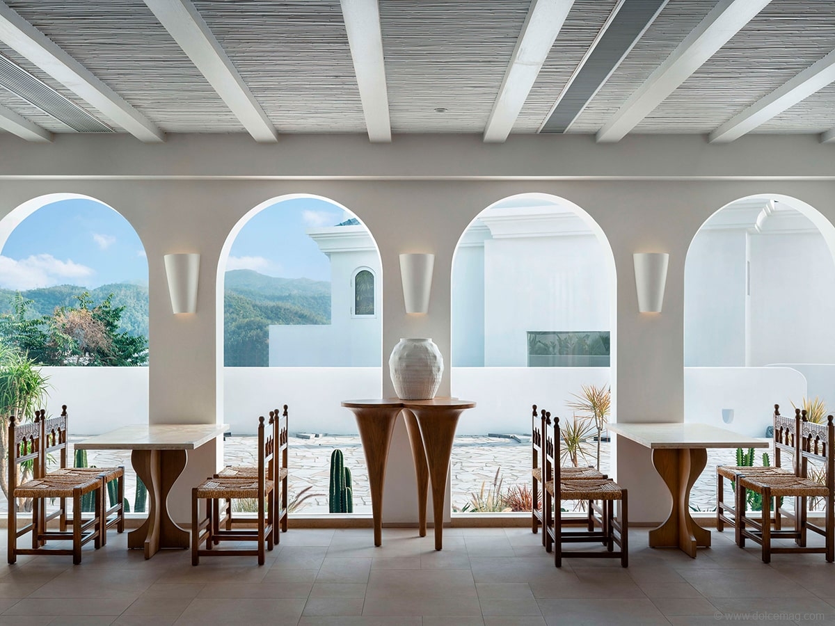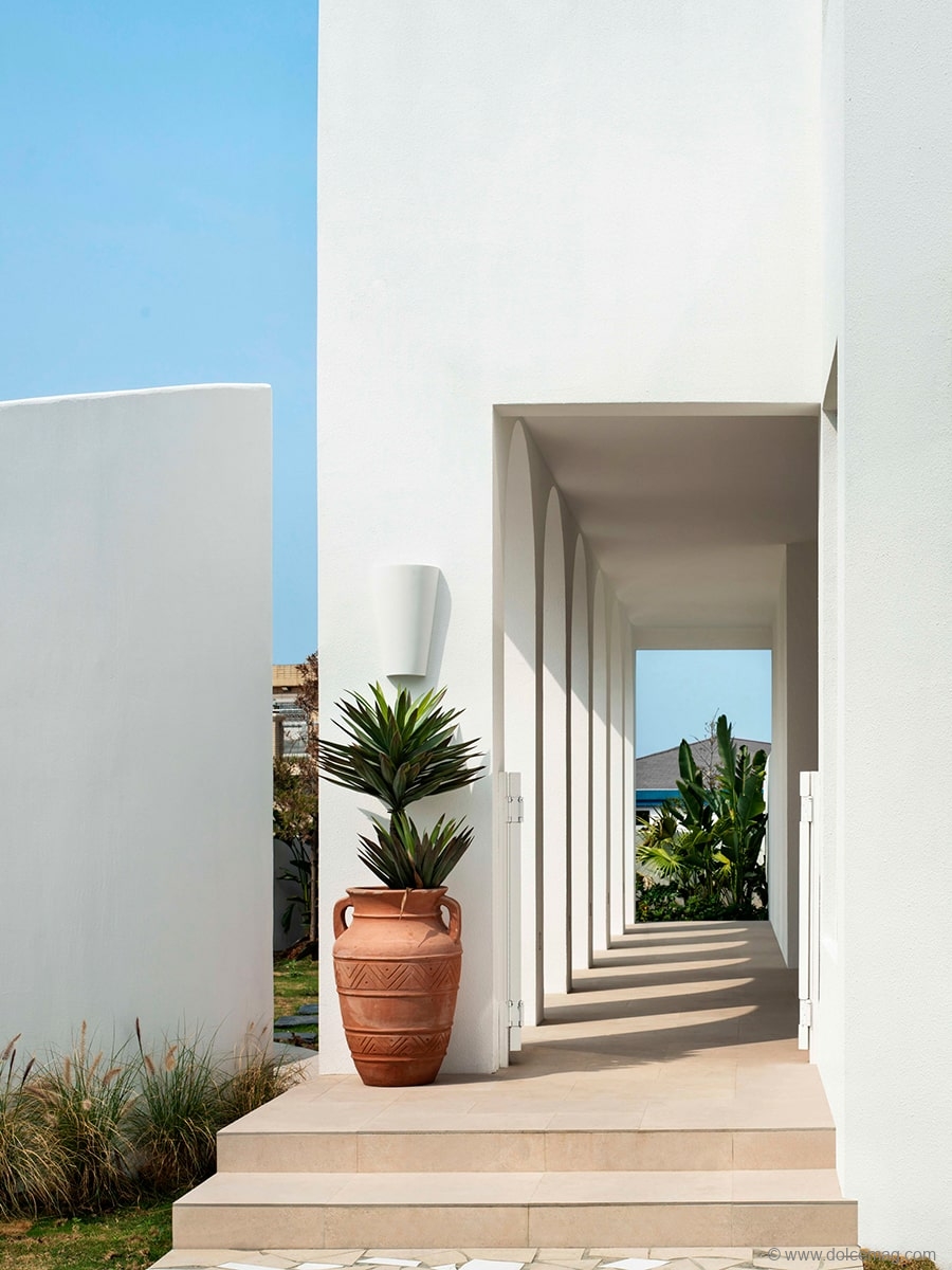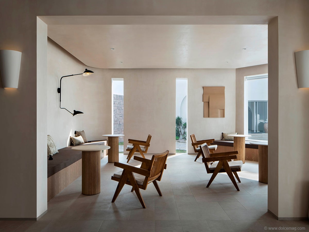 With their innovative eye for design, they have realized a building with a series of minimalist spaces for guests. This simple and uncluttered style, using natural materials, reflects the environment and atmosphere of the surrounding landscape. The goal of this project was to create an experience that was more than just visual but rather would connect guests to the nature around them. Focusing on a “spatial experience”, the designers are redefining the expression of an “elegant vacation” as they perfectly marry the environment and brand values. The idea of an “elegant vacation” is that of space design. The building itself has the base tone of a pure elegant white, then it is combined with the blue sea and sky, which give off a relaxed feel of an exotic vacation as if you were fully immersed into nature.