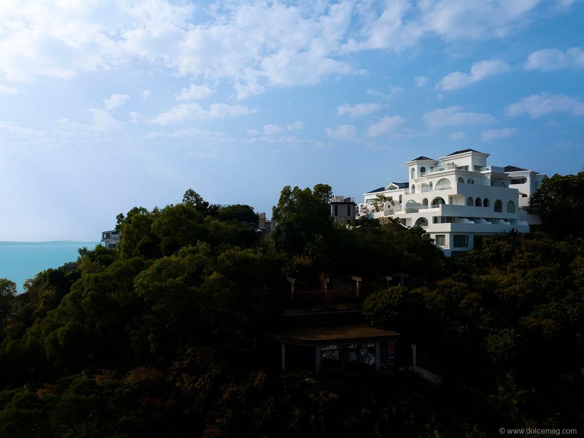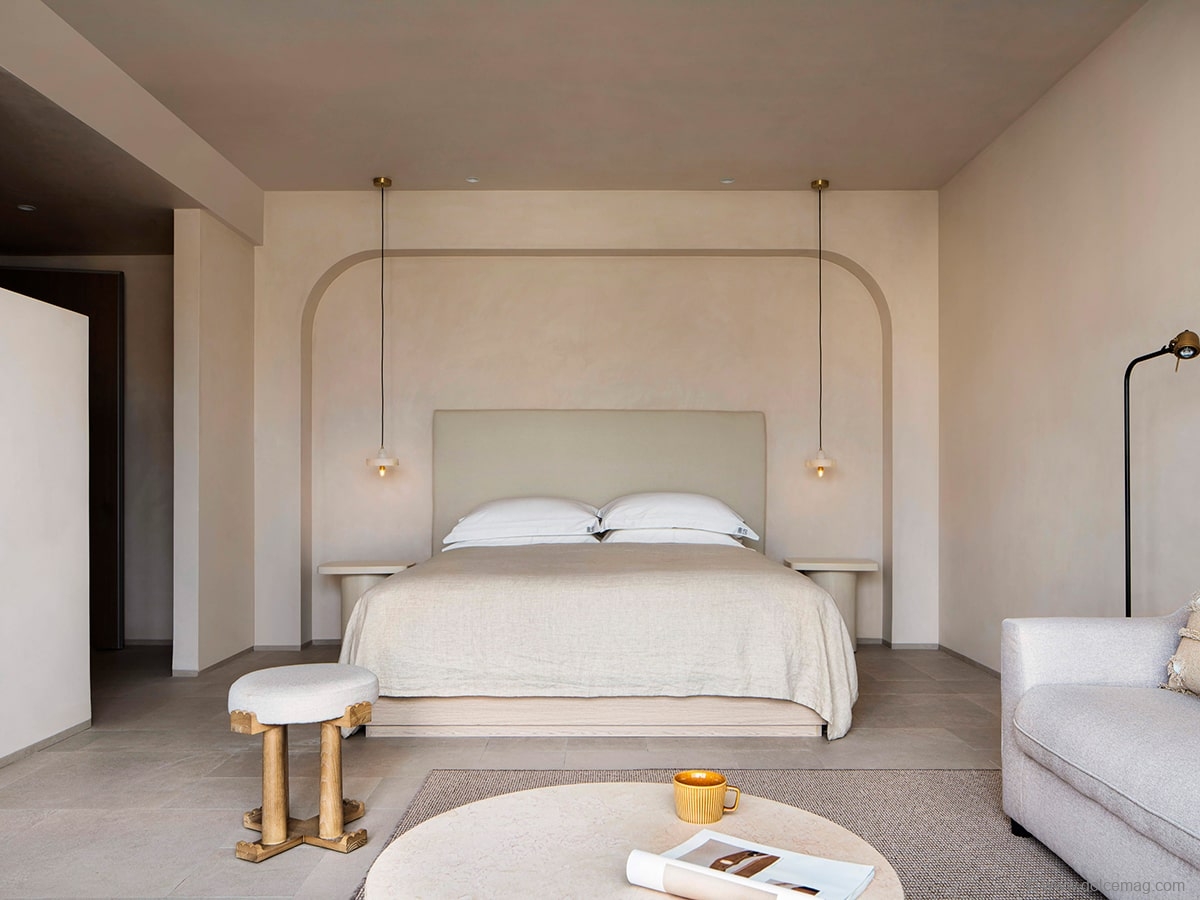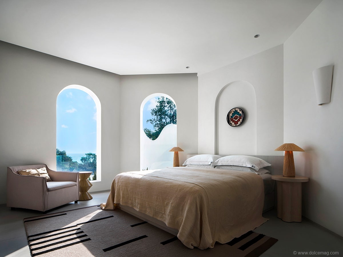 With their innovative eye for design, they have realized a building with a series of minimalist spaces for guests. This simple and uncluttered style, using natural materials, reflects the environment and atmosphere of the surrounding landscape. The goal of this project was to create an experience that was more than just visual but rather would connect guests to the nature around them. Focusing on a “spatial experience”, the designers are redefining the expression of an “elegant vacation” as they perfectly marry the environment and brand values. The idea of an “elegant vacation” is that of space design. The building itself has the base tone of a pure elegant white, then it is combined with the blue sea and sky, which give off a relaxed feel of an exotic vacation as if you were fully immersed into nature.