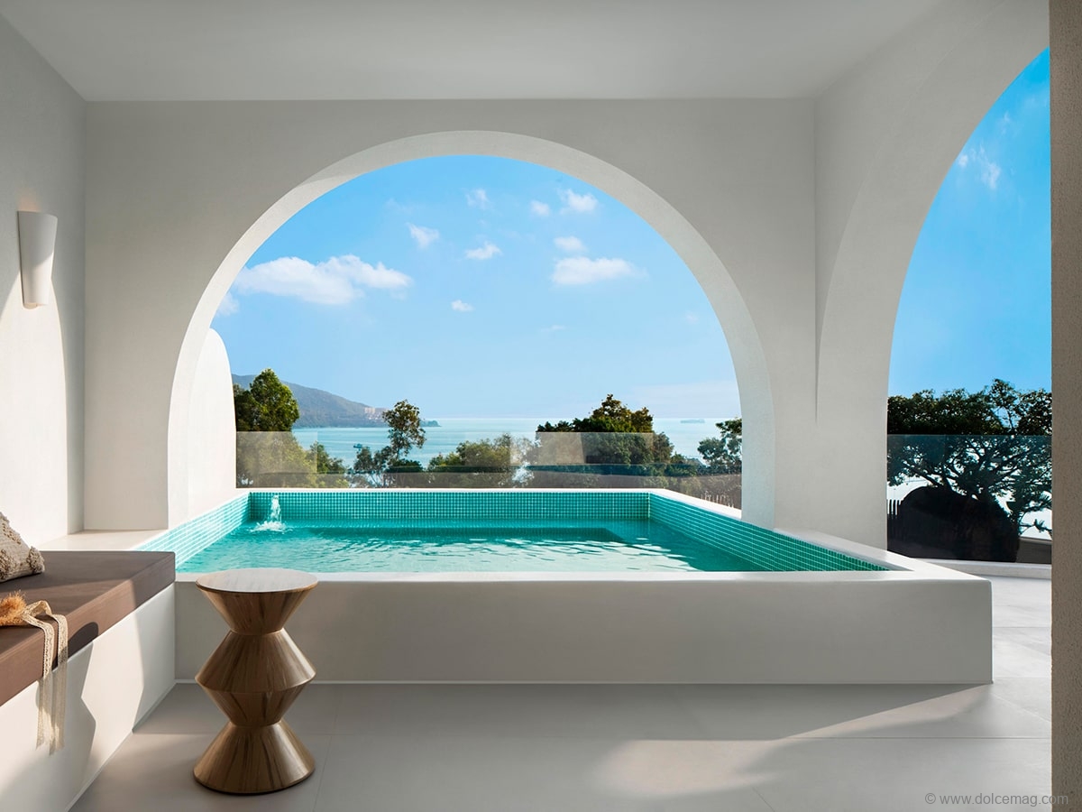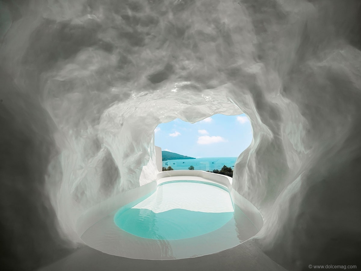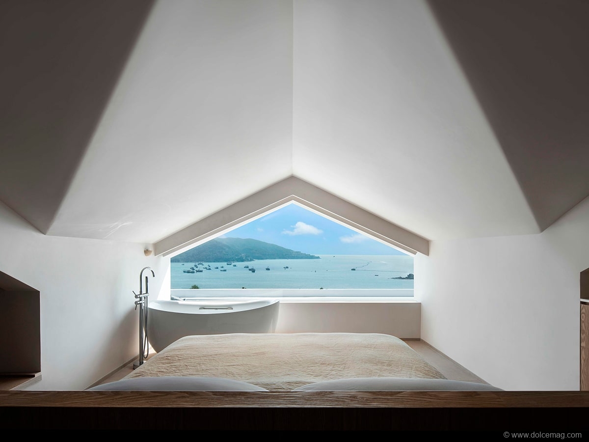 The Miyue • Blue & White Cliffside Resort is a brand-new development by GS Design that is located in Shenzhen, China. With breathtaking mountain views on the south coast of China, inspiration is taken from the beautiful landscape, and a white colour palette is brought throughout the project. This white colour palette creates a sense of aesthetic clarity, which perfectly complements the exquisite blue sea and sky surrounding it. The resort is made up of 25 rooms, all of which have a unique interior design that has a continuous core element of the different caves and baths that act as a frame for the views of the stunning landscape.