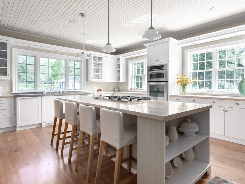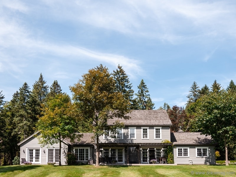 A. The home is designed in the New England style with clapboard siding, cedar shingle roof, centred front door and multi-paned windows with decorative exterior window trim. The main distinguishing feature of this property is the large private kettle lake sited in the centre of the 101-acre property. The elegant, recently built country home, total privacy, picturesque views, miles of groomed hiking trails, restored century barn and tennis court are a few of the other distinguishing features of this offering.