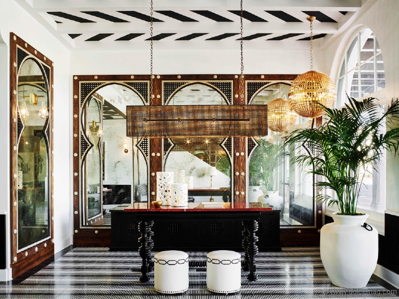 I used over one million tiles in the project (encaustic, glazed and marble), wainscotting the guest room walls in Moorish-designed tilework and graphic, monochromatic designs on floors and walls in the public spaces. Hand-printed textiles add colour and texture, from linens to velvets and leather, while custom wallpaper is used to great effect in the ballroom, where I mixed seven different designs to create a fantastical orientalist look inspired by the rooms of Renzo Mongiardino.