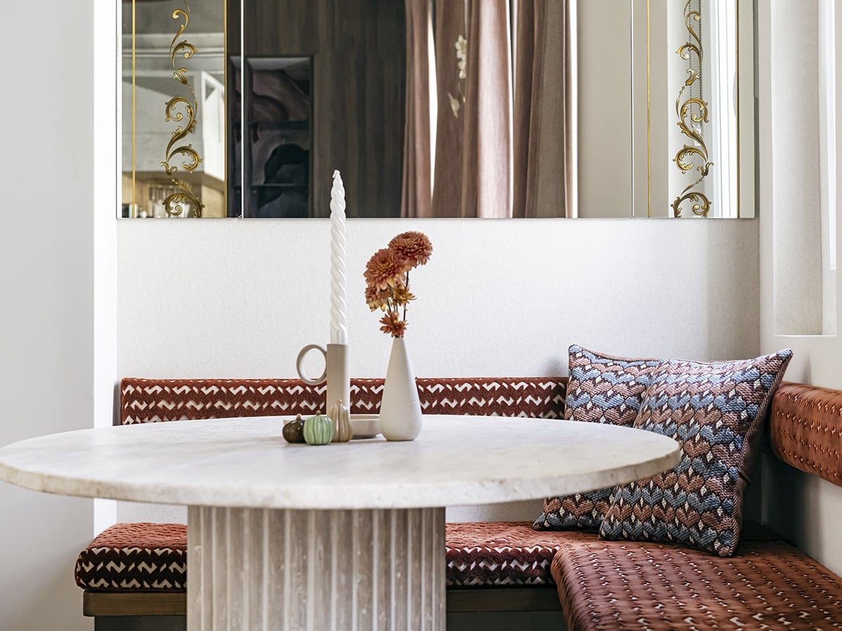 The dining room is designed to be welcoming, with a walnut wall and a flea-market mirror with golden details as highlights. The travertine table and custom-designed fabric bench serve as unique features and personalized comfort.