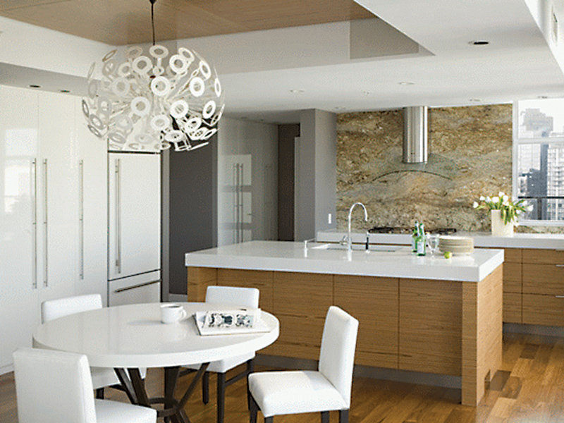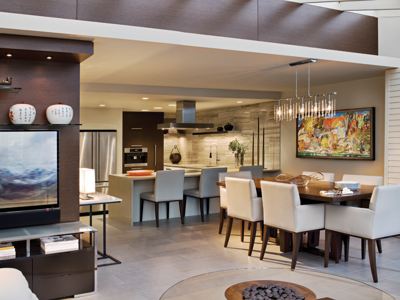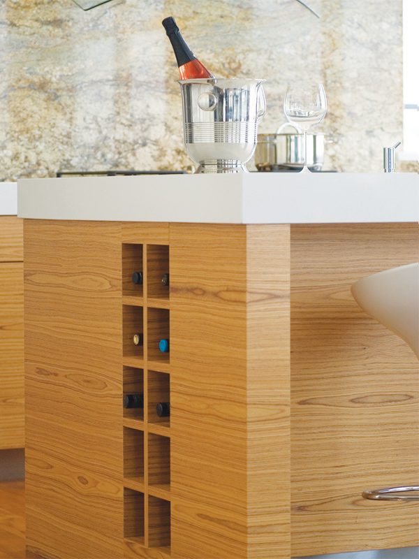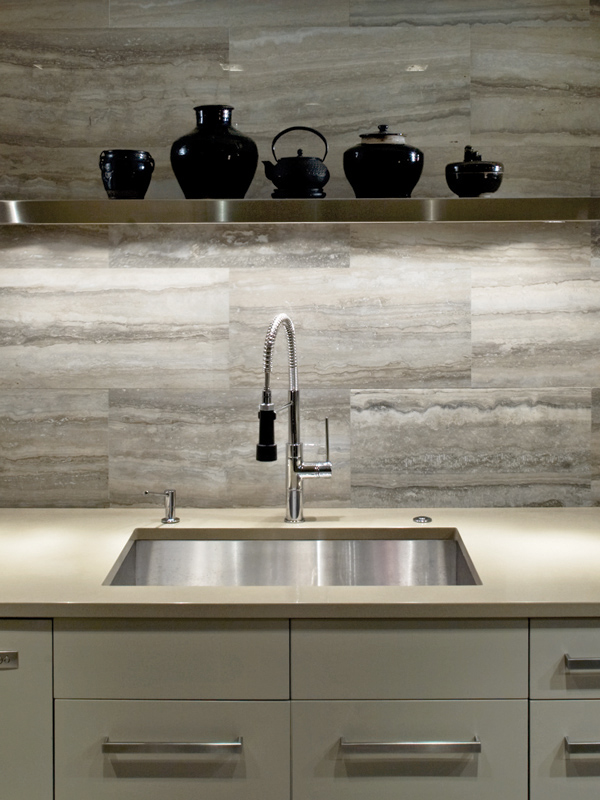Almost every home today is planned around an open-concept kitchen. Usually, the kitchen can be seen from the adjoining eating area, family room and/or media area. The trick to having an open-concept kitchen is to have a planned place for everything, so that the typical clutter on kitchen countertops is avoided. I like to make the back wall a focal point and remove overhead cabinets. To accommodate the lost storage space, I incorporate full-height roll-out pantries to house all the items that were previously stored in cupboards. Roll-out pantries provide an efficient use of space, and allow everything to be more visible and readily accessible. This concept gives the kitchen a clean, contemporary feel. In the False Creek, Vancouver project pictured above, I have tiled the wall full-height with beautiful, polished travertine marble, and hung a floating stainless steel shelf to display a collection of Oriental pottery. An eating counter was incorporated for quick meals and gatherings. Best of all, an island concept allows the chef to be part of the flow of conversation in the adjoining dining and media area.