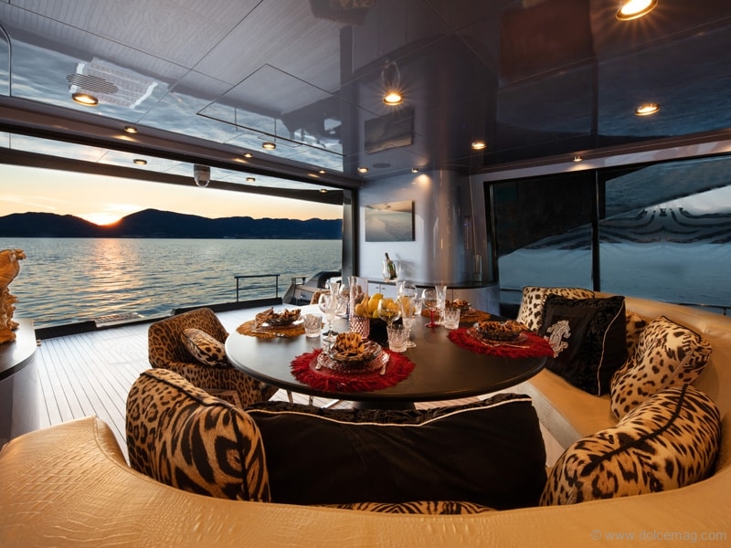 Cavalli handled the interior design himself. “My style is eclectic, and I chose a lot of African animal-skin prints for the upholstery, cushion covers and bedspreads, a theme in some of my fashion collections,” he says. “I’m also a keen photographer, and the bulkheads are decorated with panoramic photos taken during my travels.” Cavalli is overjoyed: “I am to spend as much time as I can on board…and hopefully live aboard until September.”