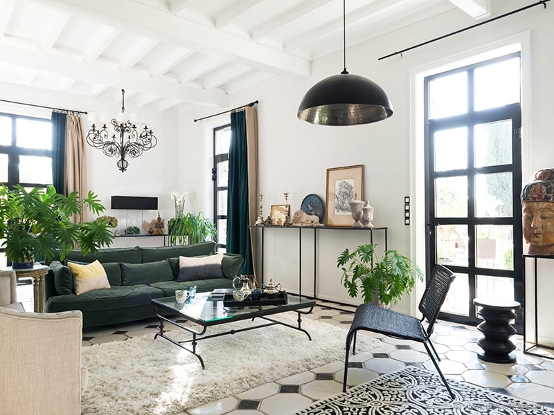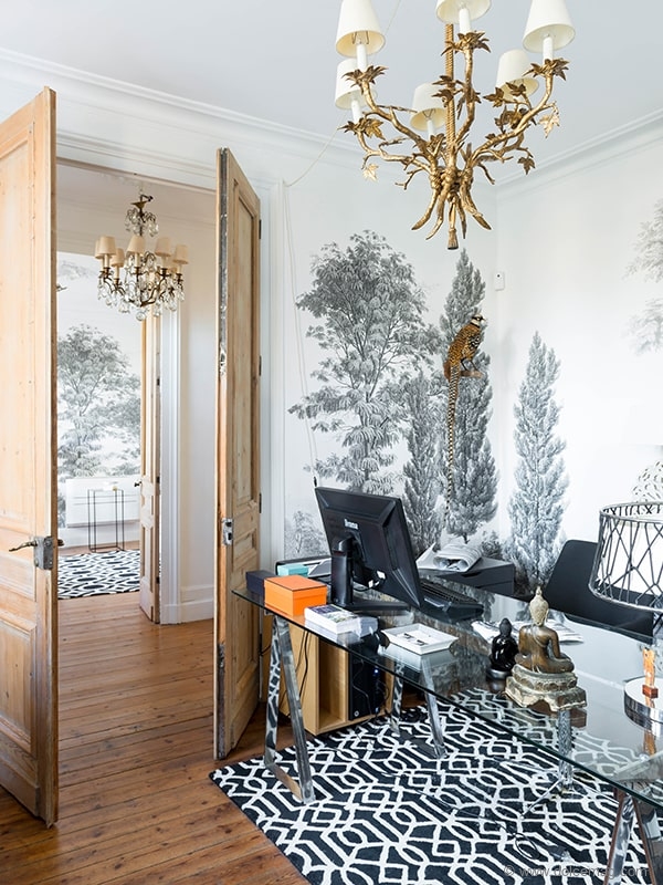 Two years of renovations were necessary to make the castle habitable. The first task consisted of ridding the building of water. To rebuild the original roof, the owners called on the family business that has been in charge of the roof for a hundred years. “The roofers were a big help, because they know the area well. They were able to guide us through the restoration,” explains Anne. “The works were complicated, especially since we lived in the castle with our two young children at the time. The final touch was the fitting out of the swimming pool in 2004. It was our reward.” The spaces have been preserved as well as the original elements still in place: the parquet upstairs, the ceiling mouldings and the beautiful old wooden doors, just stripped. All other coverings have been changed, as well as the joinery on the ground floor. “We chose black metal doors to add a more contemporary touch. On the ground, we added checkerboard. I have always adored black and white; it’s chic and timeless,” confesses Anne. “I need to live in a refined environment to create.”