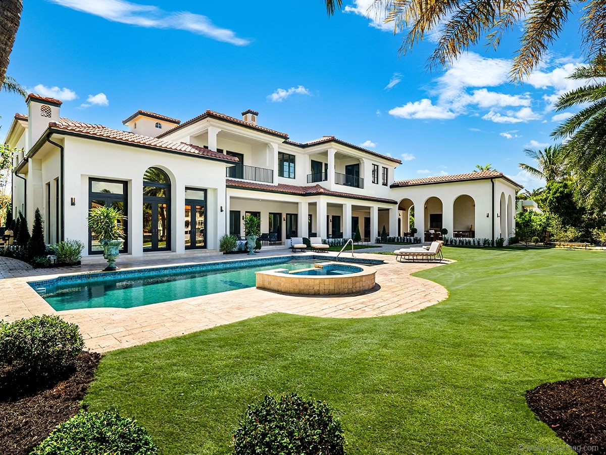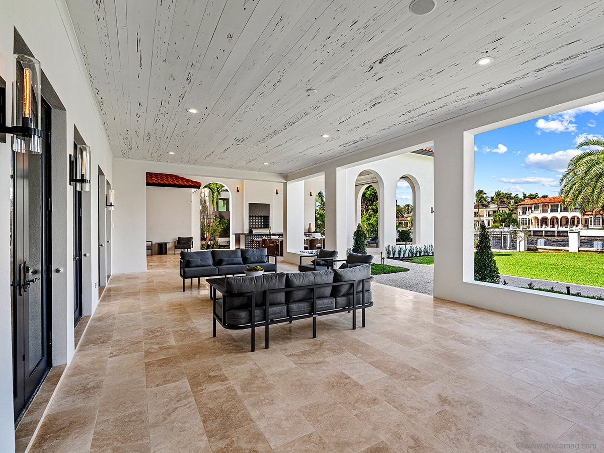 Set back on a 0.49± acre estate size lot, this bespoke estate is introduced by a row of stately royal palm trees and features a pristine manicured landscape with lush lawns, islands of sculptured ornamental plantings, and Italian olive trees. There is a 2,000+ square-foot rear loggia offering the ultimate venue for alfresco dining, with a new black granite and mosaic tile cooking and grilling station, and community dining table. The expansive lounge area overlooks the Intracoastal Waterway as well as a waterside resort-style heated saltwater pool with spillover spa.
