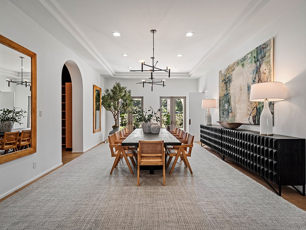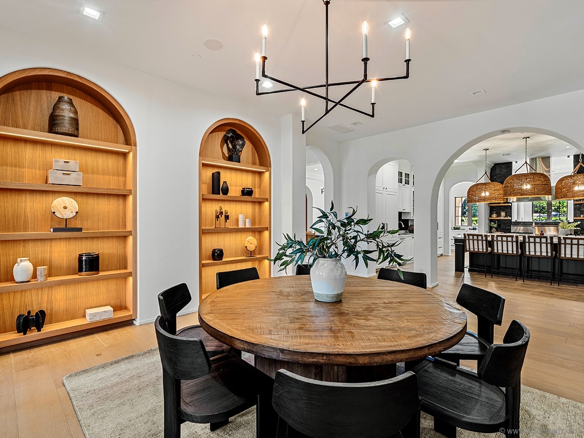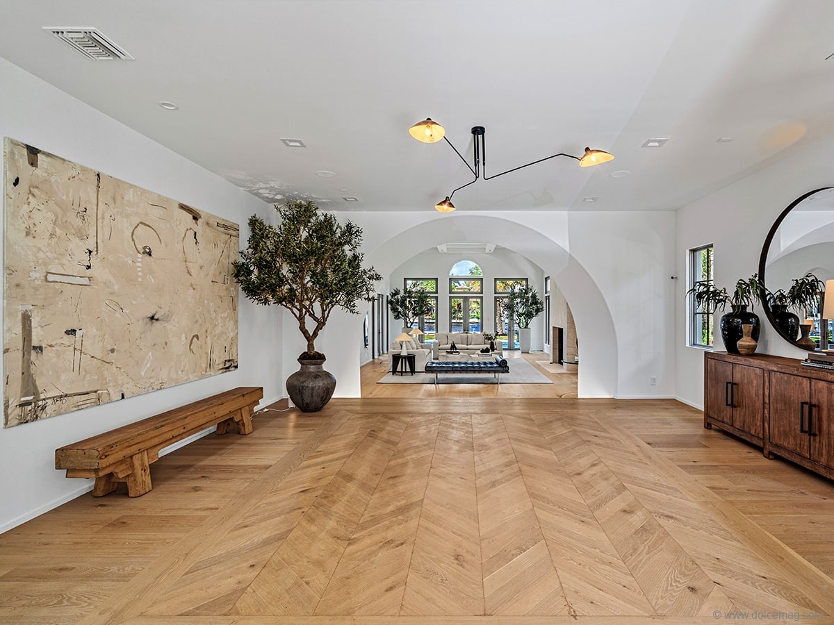 Inside this bespoke two-story, walls were altered, spaces redefined to transform it with a more casual California coastal vibe. Here dreamy white walls, wide plank bleached oak floors, crossbeam ceilings, modern fireplaces, studio lighting, and a more sculptural front staircase further streamlined the open plan and amplified the arches which are its focal point.