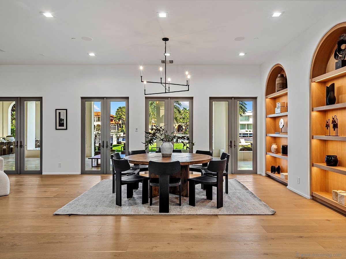 Introduced by an iron and glass entry door, the grand foyer is a study in light, space and architectural detail, with a chevron-patterned directional floor that points the way through a wide beveled arch to the grand salon and waterway beyond. Despite the transformation, the estate retains its original massing and character from the exterior, which belies its airy new interior.