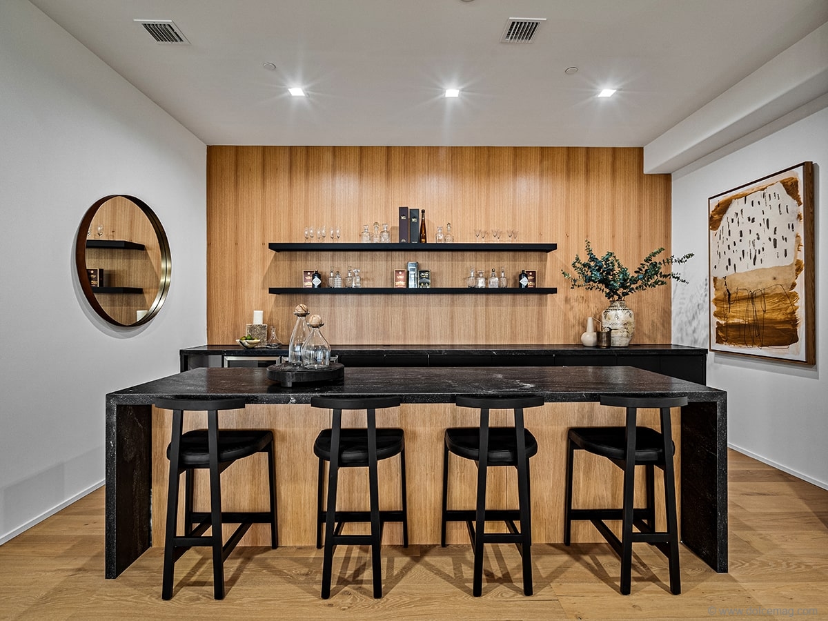 Among the five bedrooms and six-and-a-half bathrooms, the secluded primary suite is a stand-out encompassing an expansive bedroom with fireplace, sitting room, second office, covered waterfront balcony, dual spa-inspired bathrooms with walk-in showers and soaking tubs, and an expansive shared boutique fitted walk-in closet.