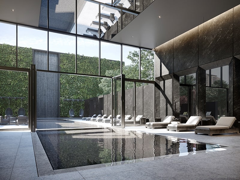 In the lobby, a cascading water feature welcomes residents, evoking feelings of energy and movement when you first step into the building. A wellness centre, featuring a spa and indoor-outdoor swimming pool, round out the offerings, with expansive floor-to-ceiling glass screens separating the two sides of the pool. Views through the screens frame a dramatic water feature that flows into the far end of the pool. “To me, the key elements were water and space — with water moving in the building the way it does. There’s this continuous flow of motion that’s recharging for people,” says Williams. “Certain places just hit us as humans, reminding us that we’re alive.”