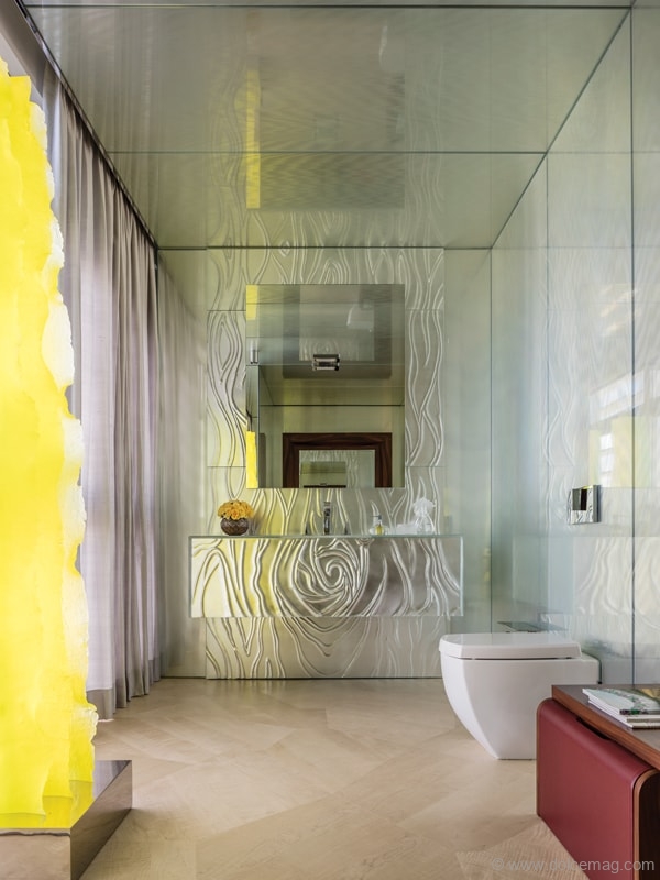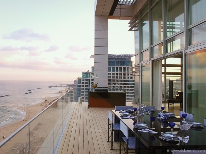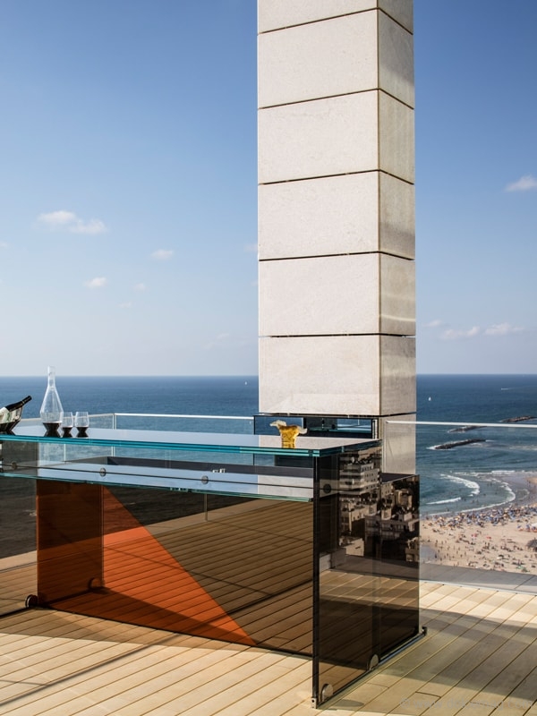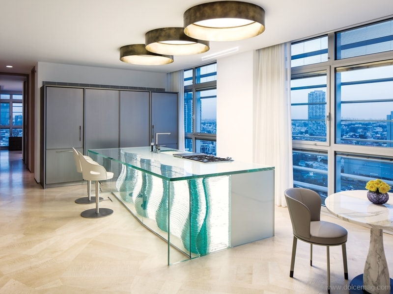 A. There were many challenges along the way. Because of the bespoke nature of the penthouse, we worked with many different suppliers and artisans. But without [a] doubt, the staircase was the most challenging. First, [it was because of ] the design and working with the right company to help secure my vision, [and] second, [it was because of] the logistics. Weighing six tonnes in total [and made of 220 layers of polished glass], we reinforced the floor and the wall to support the structure. Then, bringing the stairs to Israel was a complex story, and to get the stairs into the penthouse, we closed a main street in Tel Aviv to move [them] with a special crane. The result, however, is worth it.