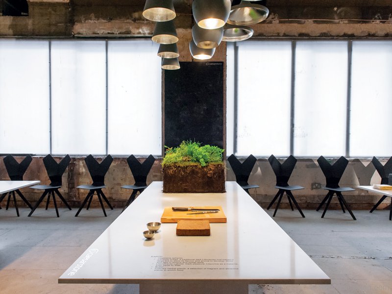 Dixon’s great vision for this team-up was, essentially, to create four different kitchens, each one a unique culinary playground themed after an element — ice, fire, earth and air. Each kitchen and element was also chosen to reflect the culture of one of the cities the Programme will be visiting in 2016. The “Fire” kitchen, for example, represents Milan, while “Ice” is Toronto-inspired (go figure), experimenting with the translucent, luminous Caesarstone quartz and food being served on a floating water conveyer belt across frozen surfaces.