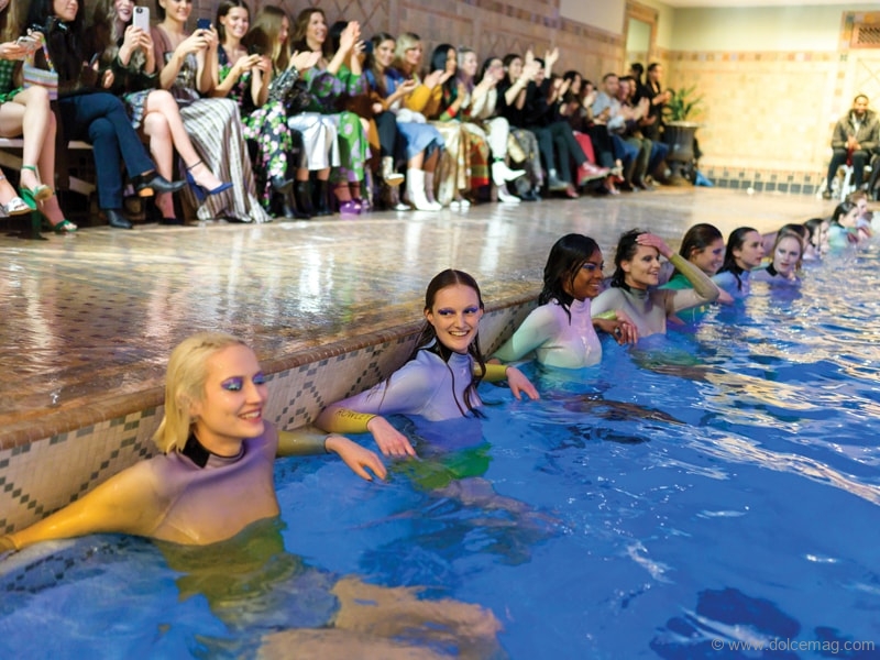 Presenting her fall 2019 collection, designer Cynthia Rowley hosted a runway show at the pool at London Terrace Towers on Feb. 12. One effect used in a selection of her ready-to-wear pieces making up this collection is ombré. Rowley was inspired by nature’s ombré — sunrises and sunsets — and emulates that within her clothing. Closing the show, Rowley displayed an assortment of the brand’s signature wetsuits in an array of pastel ombré patterns, with the models jumping into the pool as the grand finale.