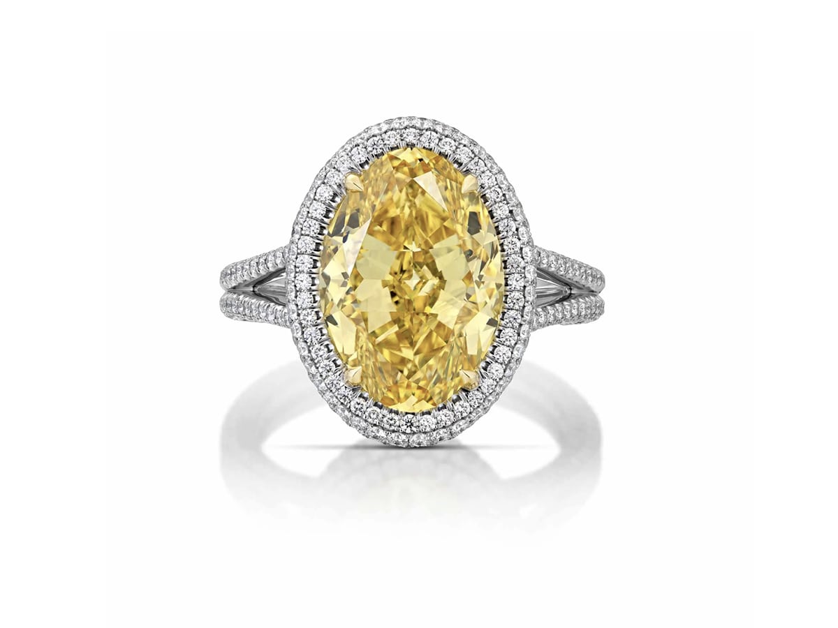 This extraordinary micro-pavé diamond ring showcases a 5.18ct oval diamond. “Zimmi” refers to the rare vivid yellow that is largely found in the Zimmi region, in the heart of Sierra Leone’s rainforest.
