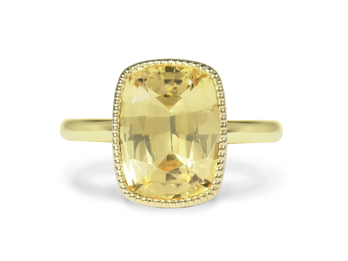 A bold and cushion-cut 5.02ct yellow sapphire that sits upon an 18-karat yellow gold band.