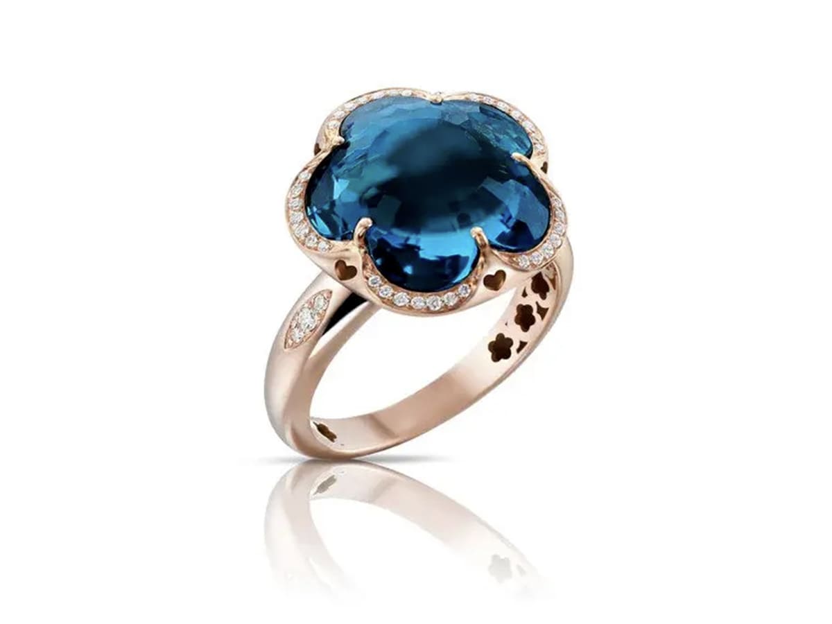 In 18kt rose gold with London Blue topaz and diamonds, this ring portrays the Bon Ton flower, the embodiment of Mother Nature.