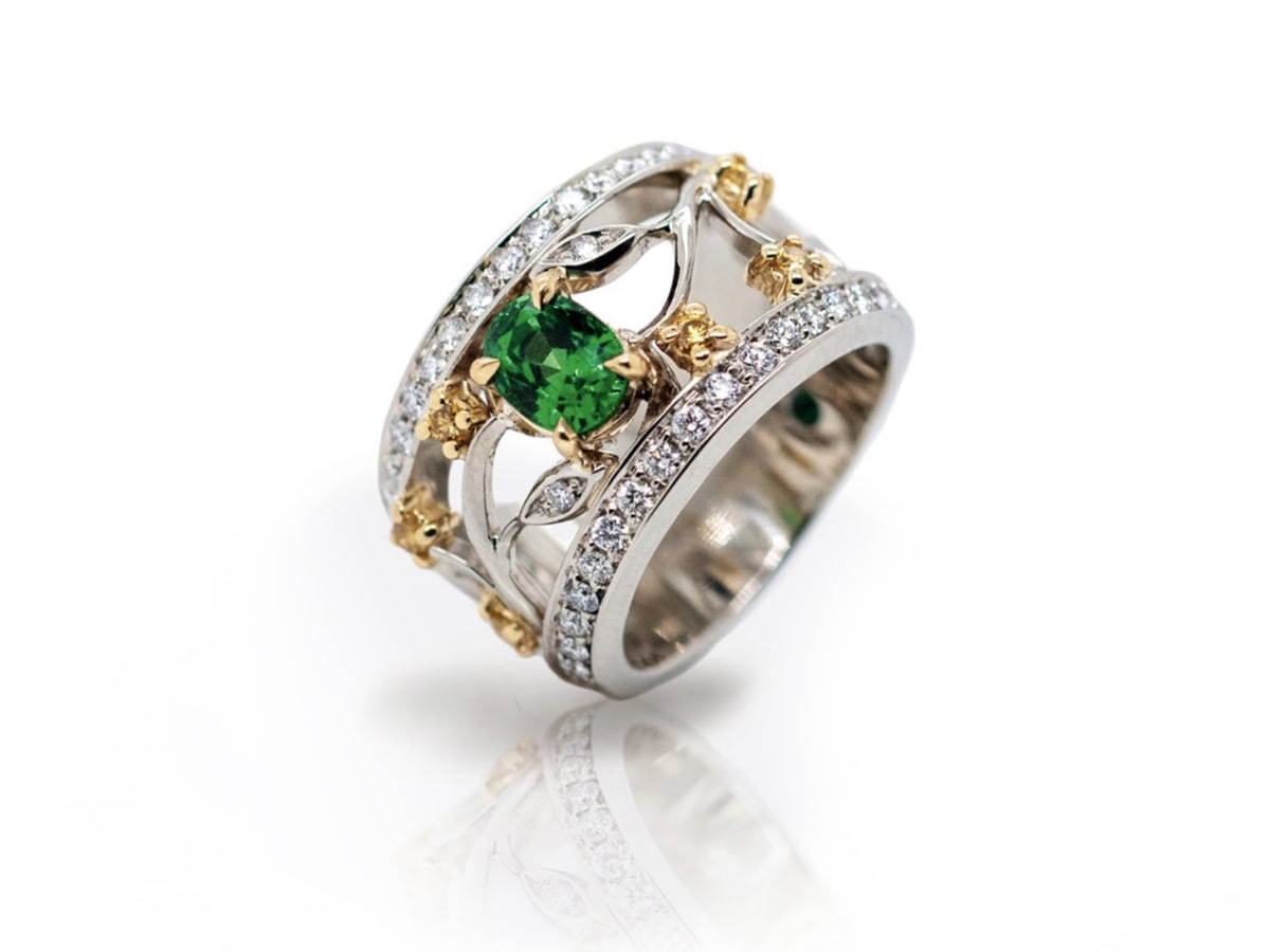 Highlighted by a lush green tsavorite garnet embellished by floral diamonds, foliate motifs and centre framed with 18kt yellow and white gold.
