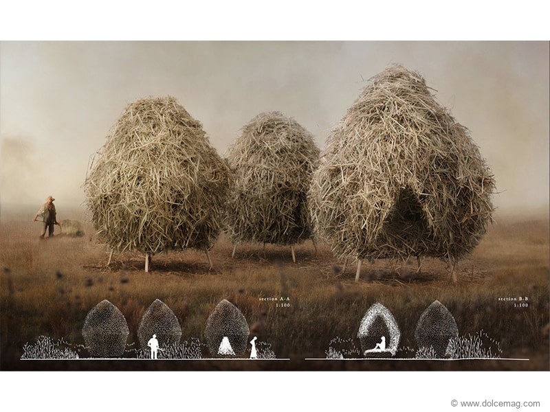 His work consists of three hay structures made out of the very plants surrounding them. Unlike normal hay-drying structures, Bäckström’s haystacks have an interior room. The small space inside each haystack is meant to provide a refuge from today’s world, allowing us to rethink how man and nature relate to one another and how we can live more mindfully in the future.