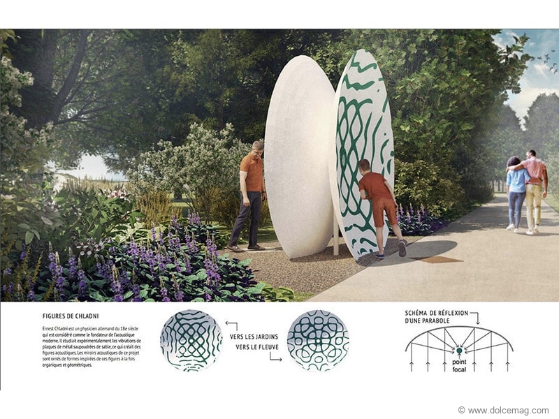 Landscape artists Emmanuelle Loslier and Camille Zaroubi, along with project consultant and civil engineer Vincent Loslier, bring us “Miroirs Acoustiques”. Both as landscape architects and musicians, Loslier and Zaroubi are particularly interested in natural phenomena that enable them to include movement and sound in their work. Their works emphasize repetition, symmetry, series and recurrences.