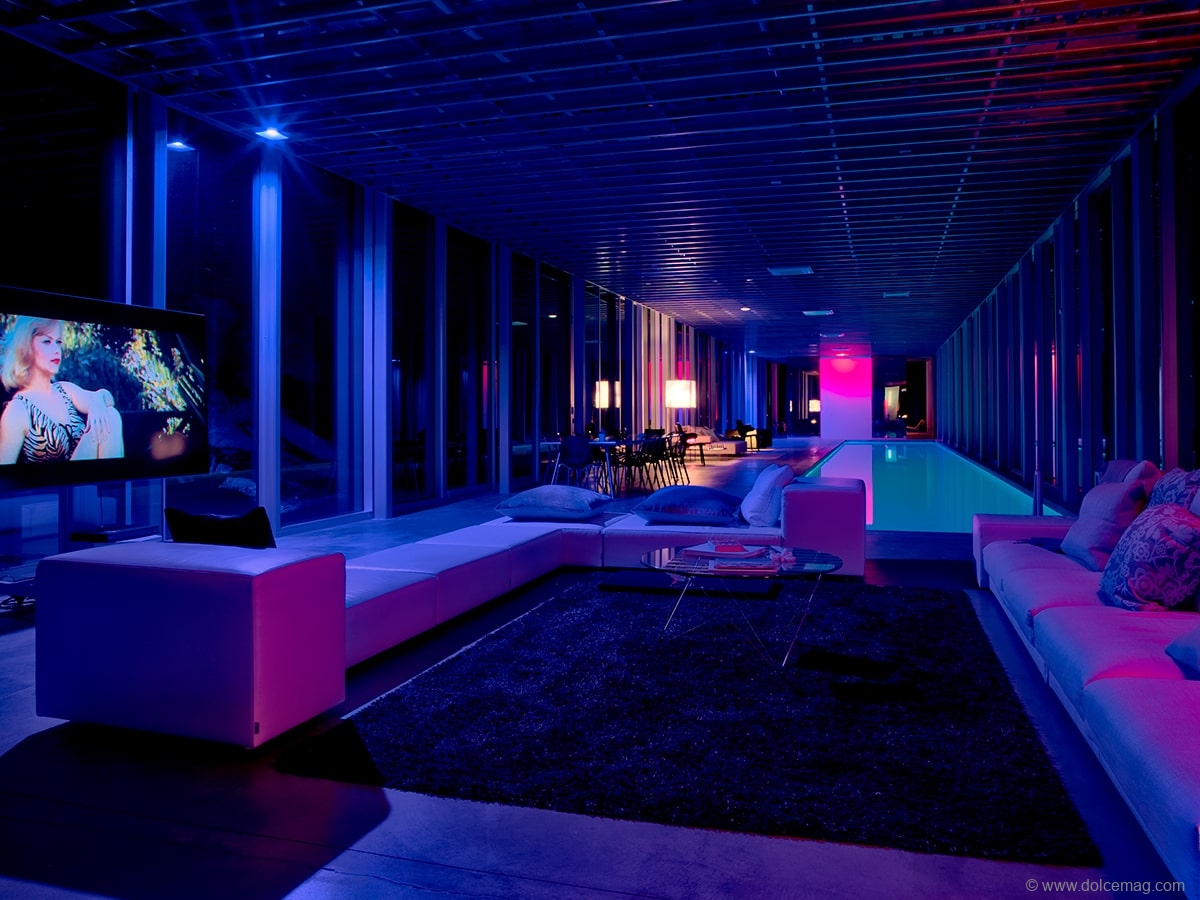 Inside the home, there are massive floor-to-ceiling windows, which further blur the lines between indoors and outdoors and show off the one-of-a-kind view. The glass walls open up on three sides, thanks to sliding doors, a new take on the indoor-outdoor living concept that we all love. The home has three large bedrooms, which each have their own en-suite bathroom, including premium Boffi fixtures. The primary suite feels like a five-star-resort and is equipped with a soaking tub, floating vanities and a rain shower. The chef’s kitchen is as high end as the rest of the home with dual ovens, separate refrigerator and freezer storage, marble surfaces and top-of-the-line appliances from Miele, Sub Zero and Wolf. Another spectacular feature is the Flos lighting system, which creates ambient lighting with different colors to fit any mood or occasion. Finally, the 100-foot heated indoor swimming pool that spans the length of the living room and a 224-square-foot projection wall for screening fabulous films round out the ultra-luxe home.