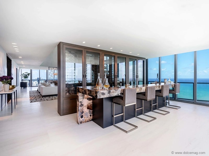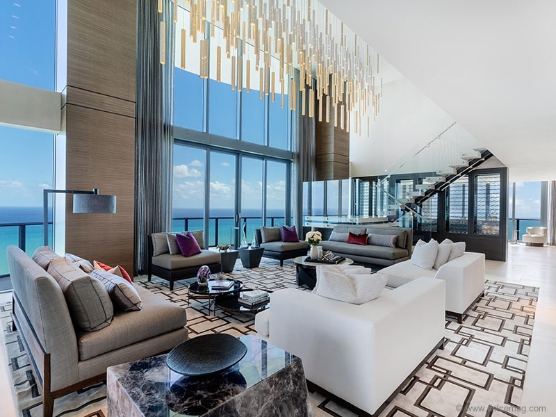 Motel Row is now currently demolished and has been replaced with fancy high-rise condos and fabulous penthouses that are dominating the skyline. Some of these magnificent penthouses include The Pinnacle, Acqualina, Trump Palace, Jade Ocean and the Trump Towers I, II and III. On December 16, one of the most glamorous penthouses Regalia is going to auction! Regalia was built in 2016 on the site of a 1960s-era Holiday Inn that was demolished. It was originally priced at $39 million and is now listed at $25.5 million.