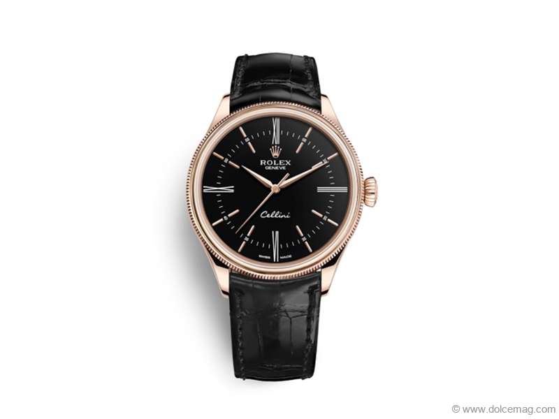 A timeless timepiece is always in season, no matter the occasion. The Cellini watch is clear and simple with black hardware and dial alongside subtle hints of Rolex’s patented 18K Everose gold.