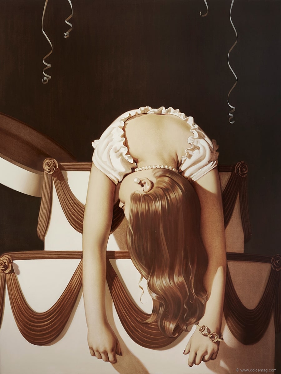 A statement from the gallery talks of Weyant’s first work as “a sequence of darkly cinematic vignettes depicting a dollhouse and the strange, cloistered lives of its inhabitants.” Another series of images looks at the topic of American suburbia. While most of the artist’s work focuses on people, there are also still-life pieces of flowers, fruit and revolvers, always delivered with a surreal and unsettling undertone.