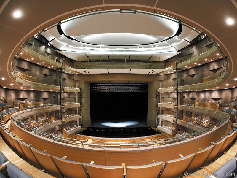 While “contemporary in its expression,” many of the principles of the classical opera house are employed internally. Diamond describes the wood-lined, horseshoe-shaped auditorium wrapping from one side of the stage to the other. “The horseshoe is a very good sociological shape because the audience has a sense of itself.” It improves sightlines while also creating connection between audience and show. “The arms of the building, of these balconies, stretch out to the performers,” he explains. “There’s an embrace of the performers, so they feel close to the audience.”