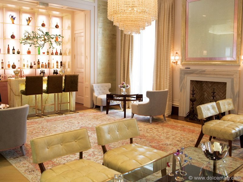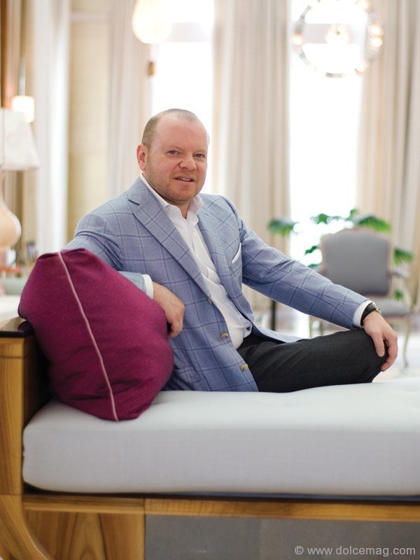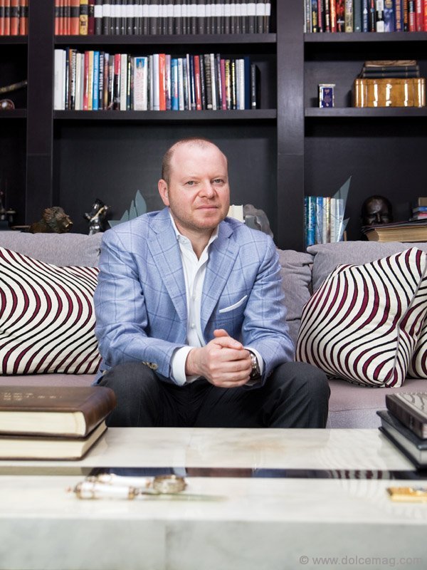 Shnaider makes the creamy block of stone behind him look malleable as he melts into it and crosses his leg in the Katherine Newman designed home he shares with his wife Simona and their three daughters. It’s the edifice of entrepreneurial stardom. Candid family photos are juxtaposed with highbrow art in gilded frames; fashion-focused books, such as Masterpieces from the House of Fabergé and Carolina Herrera, add class to glass coffee tables; and 12 massive onyx columns kiss the ceiling of a great room too grand for words. The stone was imported in pieces from Iran and aligned on-site, vein-to-vein, says Shnaider, who looks like he walked off a Russian runway in his pale blue Tombolini blazer and A.S. embroidered cuffs. The worn, Red Bendel bracelet around his wrist seems innocuous as it rivals an IWC Schaffhausen watch but, at the price of warding off the evil eye, it becomes invaluable. With two dinners ahead of him — one personal, one business — an early start at the gym and a meeting at noon, Shnaider’s days are as crammed as his library’s wall-to-wall bookshelves. He only speaks when there is something to say and, when he does, his voice resonates in a room that would much rather seat a hundred than a handful.