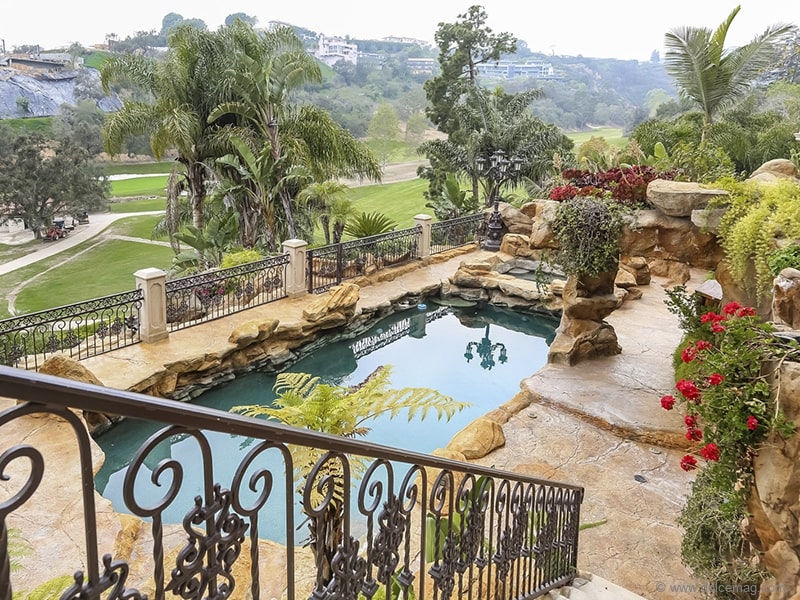 This 6,800-square-foot Mediterranean-styled villa offers unobstructed views of Los Angeles and, for additional privacy, sits overlooking the exclusive Bel Air Golf Course. The home contains six bedrooms, six bathrooms, a formal living room, dining room, media room and is centred by a grand foyer featuring a circular staircase accented by intricate iron railings.