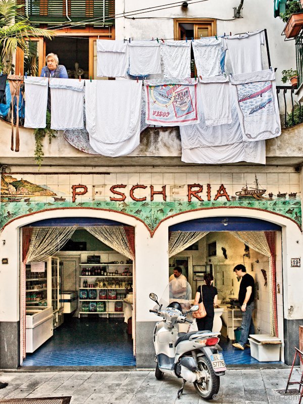 I see weathered fishermen paddling rowboats surrounded by the expansive Tyrrhenian Sea, bringing fish to local restaurants where nobody’s in a rush. There’s no need for reservation of any type and the attitude is “chi va piano, va sano e va lontano,” meaning, “who goes slow, goes healthy and goes far.” Life goes slowly and surely here. That’s why lunch in southern Italy is about three hours long and the only “golden arches” are the ones on well-tanned feet sporting Positanese sandals. On the Costiera Amalfitana, you find fresh Mediterranean cuisine cooked just like grandma’s.