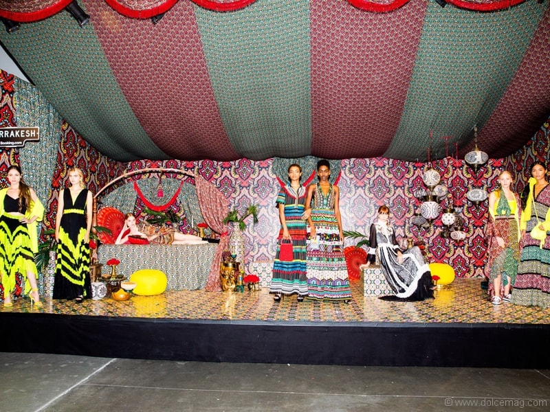 The alice + olivia look inspired by Marrakech: Black dresses with yellow lace trim and colourful, patterned maxi dresses evoke the sights of Morocco.