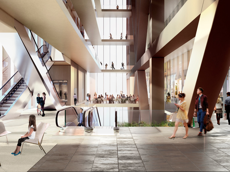 The steel exoskeleton structure eliminates the need for columns or pillars to support the building. Mizrahi explained in the winter 2014/15 issue of Dolce Magazine that a major component of the tower would be an open-concept retail space free of structural columns that would obstruct the line of sight. This style of building allows him to deliver on that vision, with more than 240,000 sq. ft. of retail space under 22-foot ceilings.